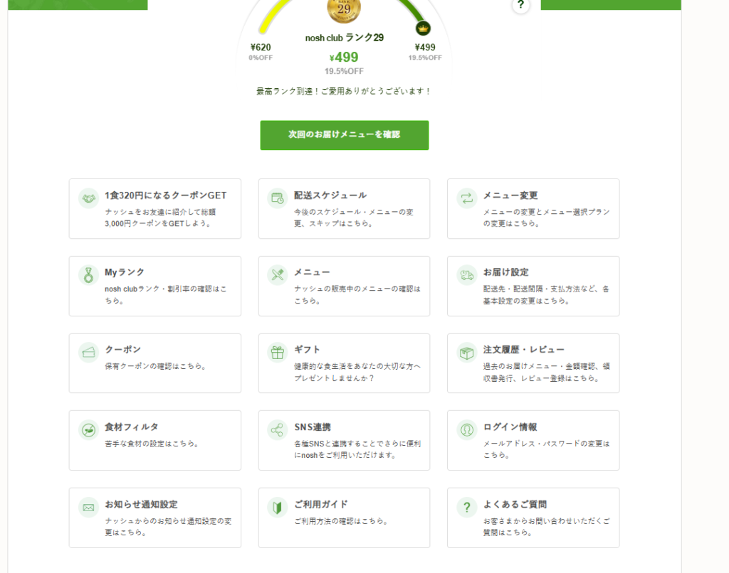 継続割引nosh club(最大約16.5%OFF)最安値1食499円マイランク制度(最大13%OFF)